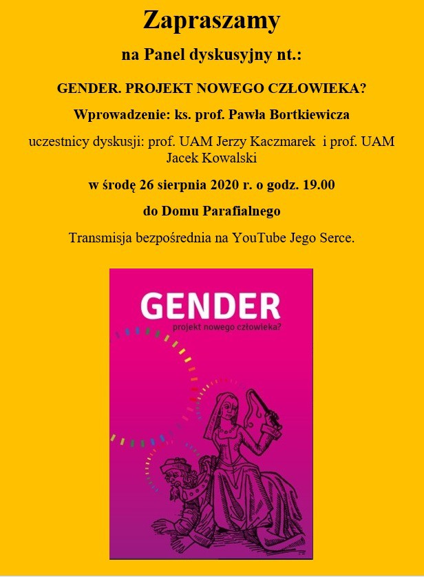 Zapraszamy wszystkich w środę 26 sierpnia na godz. 19.00, do Domu Parafialnego, najpierw na wykład: GENDER. PROJEKT NOWEGO CZŁOWIEKA? - ks. prof. Pawła Bortkiewicza, a następnie na dyskusję panelową.