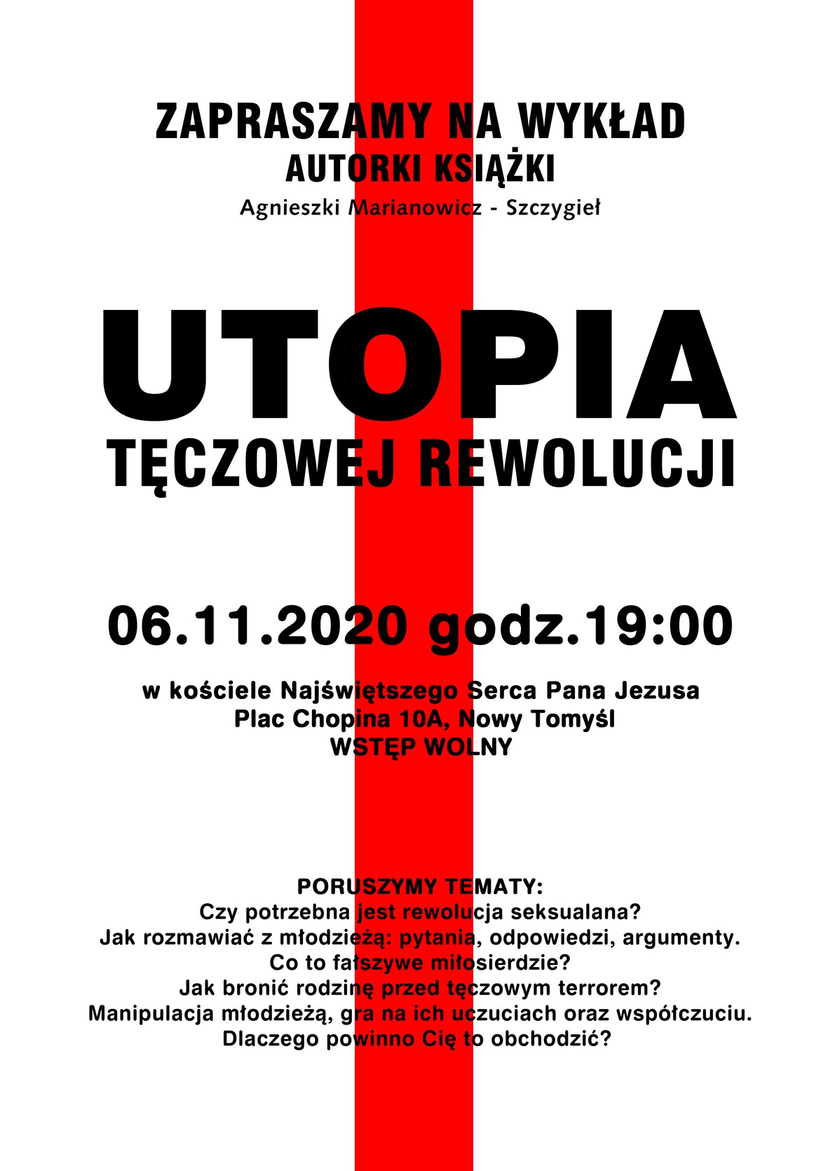 Zapraszamy na wykład: Utopia tęczowej rewolucji - autorki broszury o tym samym tytułem - Agnieszki Marianowicz - Szczygieł w piątek 6 listopada 2020 r. o godz. 19.00. Miejscem spotkania będzie nasz kościół. Odwołane z powodu ostatnich zarządzeń sanitarnych!