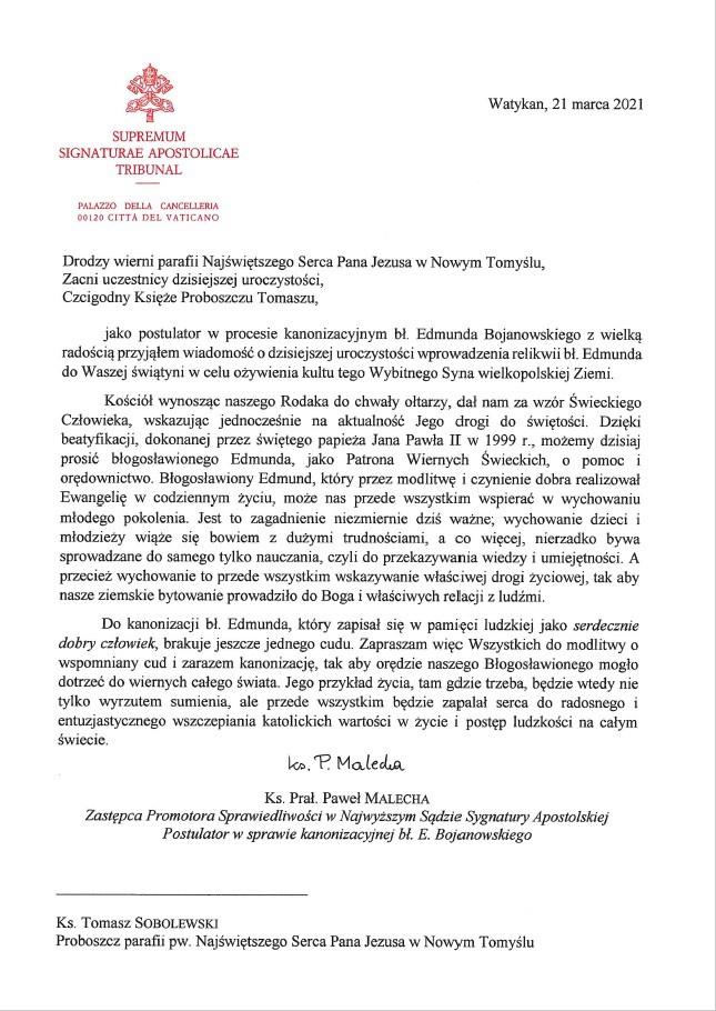 Poniżej w zdjęciach list postulatora ks. prałata Pawła Malechy.