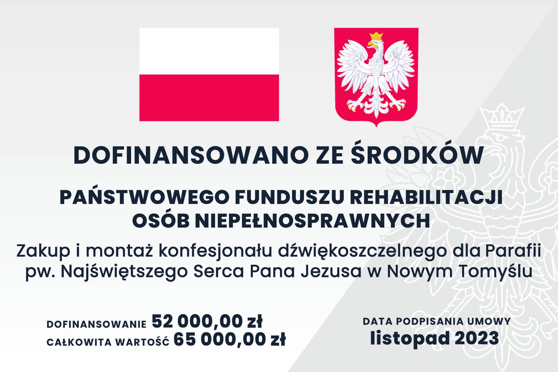 Dnia 14 grudnia 2023 r. nasz kościół parafialny wzbogacił się o konfesjonał dźwiękoszczelny, którego zakup był możliwy dzięki realizacji projektu współfinansowanego ze środków PFRON w ramach programu „Dostępna przestrzeń publiczna”. Program ten zakłada wsparcie finansowe na realizację zadań zapewniających osobom z różnymi niepełnosprawnościami dostęp do przestrzeni publicznej, a także usług powszechnie dostępnych, w tym działalności religijnej, na zasadzie równości z innymi osobami.