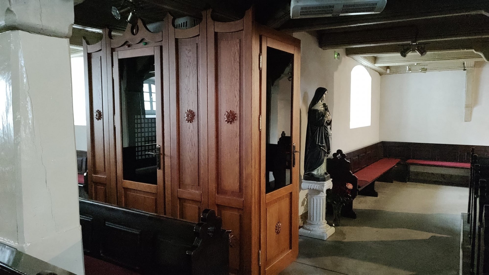Głównym celem projektu zrealizowanego przez naszą parafię było zapewnienie dostępności do posługi sakramentalnej dla osób z niepełnosprawnością narządu słuchu, a także niepełnosprawnością sprzężoną lub intelektualną, poprzez zakup i montaż konfesjonału dźwiękoszczelnego. Do tej pory, z uwagi na układ przestrzenny kościoła i umiejscowienie ławek w bardzo bliskiej odległości od konfesjonałów, nie było możliwości zapewnienia poufności podczas sakramentu spowiedzi dla osób o specjalnych potrzebach. W związku z powyższym, w ramach dofinansowania zlecono wykonanie konfesjonału z litego drewna dębowego, który składa się z trzech sekcji. Dwie z nich zostały całkowicie zabudowane, a ich ściany i sufit wygłuszone wykładziną dywanową. Ponadto, konfesjonał wyposażony został w urządzenie klimatyzacyjne oraz lampki sygnalizujące obecność penitenta i spowiednika w kabinie konfesjonału.
