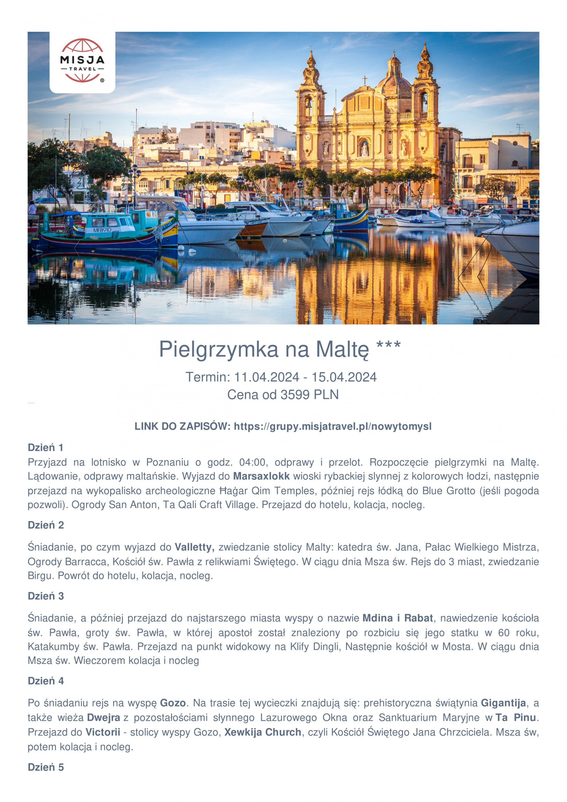 Zapraszamy na pielgrzymkę na Maltę 11-15.04.2024